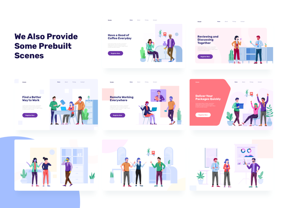 Vicolo is an illustration library to create illustrations scenes. You can use them in many things such as product illustration, UI Design, Marketing, Landing Pages, Poster, Instagram Post, or whatever you want!